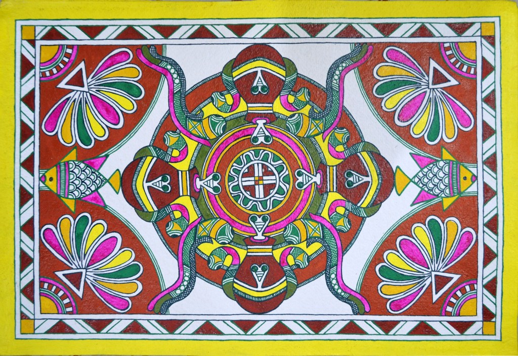 Borders are very important in a Manjusha Painting. Motifs named as Leheriya, Sarp Ladi, Tribhuj, Mokha and Belpatra are generally used for making borders. Sometimes, artists also use solid band of yellow, green or pink color after these motifs to enclose the painting and make it look complete.