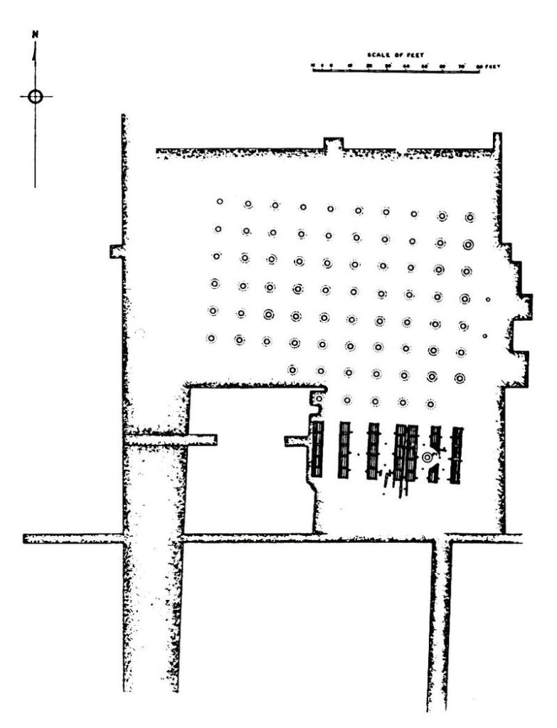 [4] Achaemenid palaces had enormous hypostyle halls called apadana, which were supported inside by several rows of columns. The Throne Hall or “Hall of a Hundred Columns” at Persepolis, measuring 70 × 70 metres was built by the Achaemenid king Artaxerxes I.
